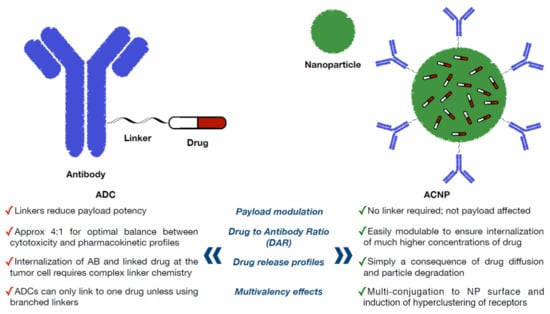 A need for better animal models that could predict toxicity and efficacy in humans is a main goal particularly for those agents with immunologic properties. On the other hand, ACNPs offer further development opportunities. (1) First, there is the payload; in contrast to ADCs, a wide variety of drugs can be incorporated into ACNPs. More importantly, a direct linker to the drug is not required, avoiding changes in the chemical structure that could modify the antitumoral properties. (2) Second, there is the drug-to-antibody ratio; the versatility of the ACNPs to modulate the cargo of antibodies over the surface by different conjugation strategies may ensure the internalization of a much higher concentration of the drug [70]. (3) Third, there is the drug release; the release of the drug in ACNPs is independent of the linker. The drug release from ACNPs is only a consequence of drug diffusion and nanoparticle degradation [71]. (4) Last, there are the multivalent effects; the conjugation of antibodies over the surface of NPs can provide therapeutic effects also.