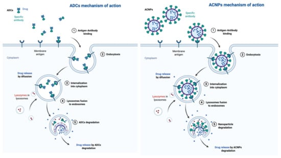 After recognition and binding to the target antigen, the internalization of the ADC-antigen complex into the cell is produced through receptor-mediated endocytosis [5,33]. Internalization results in early endosomes formation [34]. The high affinity of the antigen–antibody binding stabilizes the interaction, preventing this back circulation and enhancing the specificity of this therapeutic approach [35]. Finally, the early endosome is transformed into a late endosome by reducing the presence of proteins involved in recycling. This late endosome couples to lysosomes that cleave the ADC, which subsequently release the free cytotoxic warheads into the cytoplasm [34,36], interfering with the cellular mechanisms and ultimately promoting cell death [37,38]. Figure 3 shows the action mechanism of ADCs in comparison with that proposed for ACNPs.