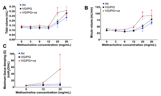 Results of whole-body plethysmography and flexiVent lung function testing with methacholine challenge did not differ between air controls and VG/PG (Figure 1). At methacholine doses greater than 25 mg/mL, the VG/PG plus vanilla group demonstrated greater tidal and minute volumes than the air control group (p < 0.05) (Figure 1A,B). Tissue damping (Figure 1C), measured via the flexiVent, was also significantly greater in the VG/PG plus vanilla group at 25 mg/mL methacholine (p < 0.05) compared to the VG/PG and the air control groups. The other lung function parameters measured via the flexiVent system were not significantly changed (data not shown).