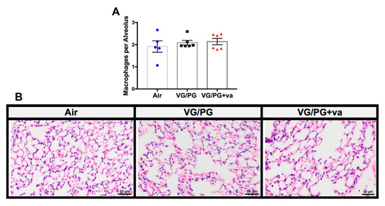 Macrophage counts on hematoxylin and eosin (H&E) stained lung slides from mice treated with VG/PG and VG/PG plus vanilla were not significantly different from the air control values (Figure 2). Counts were normalized to the number of alveoli per image due to differences in inflation of the lungs. In addition, globally the lung tissue from the air controls and the two exposure groups of mice appeared normal, with no significant changes in lung histopathology. Rarely, eosinophils were observed in the lung tissue of VG/PG− and VG/PG plus vanilla-exposed mice. The histology of the nasal passages of all mice was also unremarkable.