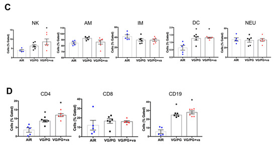 The gating strategy for identifying lung innate and adaptive immune cells is shown in Figure 3A,B. The VG/PG and VG/PG plus vanilla samples did not produce any significantly different results compared to air controls for alveolar macrophages (F4/80+, CD11c+, CD11b−), interstitial macrophages (F4/80+, CD11b+, Gr1−), or neutrophils (CD11b+, CD11c−, Gr1+) (Figure 3C). VG/PG alone did not significantly alter the percentage NK cells, but there was a slight significant increase in VG/PG plus vanilla compared to air controls (p = 0.0214). Both VG/PG and VG/PG plus vanilla groups displayed significantly increased dendritic cell populations (CD11b+, CD11c+) versus air controls (p = 0.0161 & p = 0.0142, respectively). Regarding the adaptive immune cell responses, VG/PG and VG/PG plus vanilla did not alter cytotoxic T cell populations (CD8+), but compared to controls, VG/PG significantly increased both T helper cell (CD4+, p = 0.0280 & p = 0.0077, respectively) and B cell populations (CD19+, p = 0.0003 & p = 0.0001, respectively), regardless of whether vanilla flavoring was present (Figure 3D).
