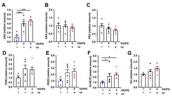 Inhalation of e-cig aerosols composed of 70%/30% VG/PG alone or with vanilla flavor affects the extracted amount of endocannabinoid and prostaglandins in the lungs. The right middle lung lobe was extracted for lipid mediators and quantified by LC-MS/MS using deuterated standards for mice exposed to air (n = 5), VG/PG (n = 6), and VG/PG (n = 6) plus vanilla. 2-AG (A), OEA (B), PEA (C), PGE2 (D), PGD2 (E), 12-HETE (F), and AA (G) levels are pictured. AEA levels were too low to quantify. Data are expressed as mean ± SEM. Differences were analyzed by a one-way ANOVA (* p < 0.05, *** p < 0.001).