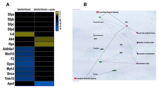 Several genes were dysregulated in response to VG/PG or VG/PG plus vanilla (Figure 5). One gene, Il-6, was upregulated and seven genes, Aldh8a1, Btnl10, F2, Gypa, Myh3, Snca, and Trim10, were downregulated in response to VG/PG alone. Two genes, Ak4 and Hpx, were upregulated, and one gene, Apof, was downregulated in response to VG/PG plus vanilla. The PG/VG e-cig aerosol dysregulated genes related to biotransformation (Aldh8a1), transcription factors expressed in pulmonary surfactant (F2) [35], synuclein-alpha (Snca), which interacts with phospholipids and proteins, as well as Il-6, a multifunctional cytokine, whose enhanced expression was correlated with reduced production of pulmonary surfactant protein A (SPA) [36]. The VG/PG plus vanilla e-cig aerosol increased the expression of Hpx, which protects against oxidative damage and affects the anti-inflammatory properties of high-density lipoprotein (HDL) [37]. Ingenuity Pathway Analysis (Figure 5B) revealed that the gene networks that are dysregulated by the PG/VG e-cig aerosol we used are associated with metabolism of cellular proteins and with control of lipid levels.