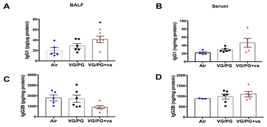 Based on the increases in T helper cells and B cell populations, we investigated whether there were corresponding increases in IgG1 and IgG2b antibody production by ELISA in serum and BALF (Figure 6). The levels of IgG1 and IgG2b were not altered in serum or BALF from animals exposed to VG/PG, but there was a significant increase in IgG1 levels in the BALF of animals exposed to VG/PG plus vanilla over air controls (p = 0.0431).