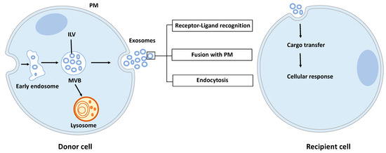 Exosomes are nano-sized vesicles generated inside cells during the maturation of endosomes into multivesicular bodies (MVBs). This is a multistep process starting with the invagination of the plasma membrane leading to the formation of early endosomes (Figure 1). Next, many small vesicles called intraluminal vesicles (ILVs) are formed inside them by the inward invagination of their membranes, and such endosomes are called MVBs [8]. The endosomal sorting complex required for transport (ESCRT) machinery is involved in this step. This machinery is composed of four complexes (ESCRT-0, I, II, III) working sequentially, but some evidence showed that vesicles can also be formed without them, involving for example tetraspanins [9] and/or lipids [10,11]. Finally, MVBs either fuse with lysosomes in order to hydrolyze their content, or with the plasma membrane to release the ILVs, called now exosomes, into the extracellular space. Similarly, the exosome secretion from the parent cell involves multiple steps: trafficking of MVBs to the plasma membrane, docking, fusion, and release [12].
