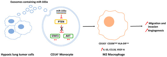 Tumor-associated macrophages (TAMs) have increasingly become recognized as an attractive target in thoracic cancers. A number of macrophage-centered approaches have been investigated, including strategies to limit their infiltration or exploit their antitumor functions [27,28]. TAMs represent the majority of the tumor stroma and maintain intricate interactions with malignant cells within the tumor microenvironment (TME), largely influencing the outcome of the cancer growth and metastasis [29]. A growing number of studies have reported the capacity of tumor cells to communicate with immune cells from the TME through exosomes release, thus leading to immune suppression and tumor evasion. In the case of TAMs, TEXs induce mainly the polarization of macrophages into the M2-type, but few studies have been conducted in thoracic cancers [30]. A recent study by Pritchard et al. showed that lung tumor cell-derived exosomes promote M2 macrophage polarization from M0 THP1 cells [4]. Interestingly they found that non-tumor cell-derived exosomes do not have this effect. Even if the authors have not identified yet the exosome cargo responsible for this polarization, their results confirmed those previously described by Hsu et al., who have for their part described an underlying mechanism [31]. They showed that hypoxia stimulates the loading of the miR-103a in lung cancer-derived EVs (Figure 2). After their internalization by the monocytes, miR-103a targets the tumor suppressor PTEN (phosphatase and tensin homolog) to decrease its expression, leading to the activation of the PI3K/AKT (phosphatidylinositol-4,5-bisphosphate 3-kinase/AKT) and STAT3 (signal transducer and activator of transcription 3) signaling pathways, both enhancing the expression of CD163+ and CD206high but also promoting factors such as IL-10, CCL18, (chemokine (C-C motif) ligand 18) and VEGF-A (vascular endothelial growth factor A). In contrast, the inhibition of miR-103a by an anti-miRNA decreases monocyte polarization into the M2-type.