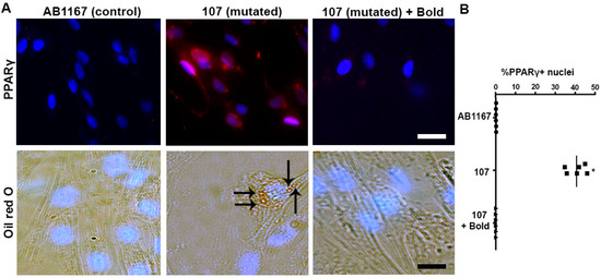 Besides, and consistent with the finding that myoblasts acquired the adipogenic commitment, several 107 cells contained triglyceride accumulation as denoted by their oil red O positive staining at day 6 of differentiation (Figure 1A, bottom middle panel). Whereas, AB1167 cells or 107 cells treated with boldine remained negative for oil red O staining (Figure 1A, bottom left and right panels, respectively).