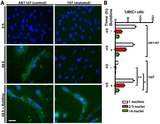 Since skeletal muscles of blAJ mice with myofibers deficient in Cx43/Cx45 expression present a low number of myofibers with internal nuclei and small CSA and low activity of serum CK [15], we thought that inhibition of Cx HCs with boldine might render a similar outcome as silencing Cx43 and Cx45 expression. To test this possibility, we first used AB1167 and 107 cells, which were induced to differentiate in the absence or presence of boldine (30 μM). Forty-eight hours later, multinucleated cells were recognized by their MHC immunoreactivity and the number of nuclei per cell was quantified (Figure 3). AB1167 cells cultured with or without boldine presented a similar number of multinucleated cells, whereas cultures of 107 cells presented very few multinucleated cells (Figure 3). Notably, in cultures of 107 cells induced to differentiate in the presence of boldine, the number of multinucleated myotubes was similar as that found in cultures of AB1167 cells (Figure 3A, bottom right). These findings suggest that Cx43 and Cx45 HCs drastically reduce the full differentiation of myotubes that is characterized by the fusion of myotubes and multinucleated cells formation [16].