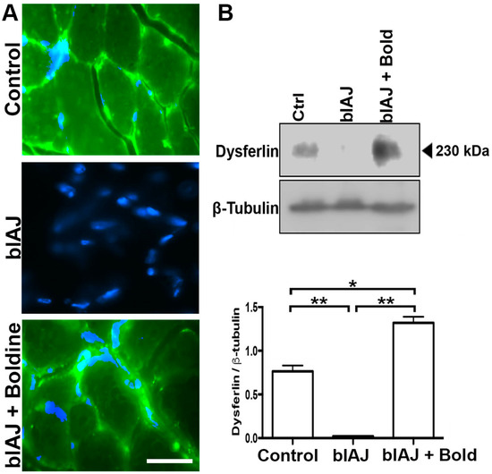 2.6. Dysferlin-Like Immunoreactivity Is Recovered in Skeletal Muscles of blAJ Mice Treated with Boldine