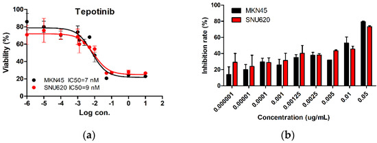 The IC50 of tepotinib in MKN45 and SNU620 cells was measured using the MTS assay for tepotinib at concentrations of 10, 1, 0.1, 0.05, 0.0025, 0.00125, 0.001, 0.0001, 0.00001, or 0.000001 µM for 48 h. On the day of the proliferation assay, the medium was removed, and 200 µL of fresh medium was added to each well of the 96-well plate, followed by 20 µL of MTS solution, and the plates were incubated at 37 °C for 1 h in a humidified environment with 5% CO2. The absorbance was measured at 490 nm using a microplate reader (Synergy 2 Multi-Mode Microplate Reader; BioTek, Winooski, VT, USA). The IC50 was calculated by nonlinear regression analysis using Prism software (GraphPad Software, San Diego, CA, USA).