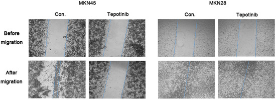 c-MET induces cancer cell migration via the stimulation of cancer cell motility [23]. The migration rate of c-MET-amplified MKN45 cells was significantly decreased by tepotinib treatment compared with that of MKN28 cells (Figure 2). These findings indicate that tepotinib decreases the motility of c-MET-amplified GC cells.
