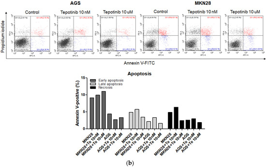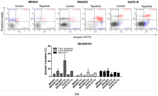 The MKN45, SNU620, MKN28, KATO III, and AGS cells were seeded into 6-well plates at a density of 5 × 104 cells/mL and were then treated with 10 nM or 10 µM of tepotinib. Cell death was determined using the annexin V-APC/PI apoptosis detection kit (Thermo Fisher Scientific, Waltham, MA, USA) using a CytoFLEX flow cytometer (Beckman Coulter, Brea, CA, USA). The percentages of intact and apoptotic cells were calculated using CytExpert software (Beckman Coulter).