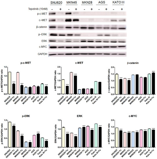 The Wnt/β-catenin, HGF/c-MET, and Ras/Erk pathways have been associated with numerous cancers [15,16,17] and mediate EMT in gastric cancer (GC) [18,19,20]. The EMT process includes adherence junction components (e.g., E-cadherin (ECAD)), matrix metalloproteinase (MMP) 7 and 9, tumor microenvironment components (e.g., cyclooxygenase-2 (COX-2)), and c-MET [21,22,23]. Aberrantly activated c-MET can drive tumorigenesis, leading to aggressive cancer phenotypes and poor prognosis by promoting tumor cell survival, migration, EMT, and treatment resistance [23]. Therefore, c-MET has been highlighted as a promising target in GC. In particular, identifying proper GC subgroups is important for the selection of c-MET inhibitors. There is a need to define the c-MET levels using various GC cells with different c-MET expression statuses. The inhibitory activities of 1449 FDA-approved drugs were evaluated in SNU620 cells during the screening of new therapeutic agents for the treatment of c-MET-related GC. Among these drugs, tepotinib showed the highest inhibitory activity; therefore, this drug requires further examination. In the present study, we evaluated the effects of tepotinib on the suppression of GC proliferation, apoptosis, EMT, and tumor progression.