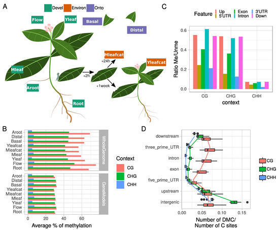 Genome-wide methylation profiles may be measured by several techniques relying on high-throughput DNA sequencing methods [37], of which WGBS provides the most comprehensive coverage and can be considered as the current Gold standard technology. Genome-wide cytosine methylation in C. roseus was analyzed using WGBS in organs and conditions reflecting the most pronounced contrasts in qualitative and quantitative MIA accumulation (Figure 1A). The objective was to highlight relationships between gene methylation and expression in main organs such Root, Flower (Flow), Young Leaf (Yleaf), Mature Leaf (Mleaf), and adventitious Roots [10] obtained from stem cuttings (Aroot). Since MIA biosynthesis has been reported to be more active in basal parts of young leaves [7], we separately analyzed basal (Basal) and distal (Distal) parts of young leaves. Due to the important stimulation of the MIA pathway observed in plants subjected to herbivory [14], we also compared two samples from fed plants. The first one corresponds to the intact part of leaves damaged by caterpillars and sampled 24 h after the feeding process (Mleafcat). The second sample corresponds to intact newly emerged leaves collected one week later after an initial attack on older leaves (Yleafcat). The entire genomic sequence of C. roseus as well as a reduced representation on gene models with +/− 5 Kbp around were used to map reads (Figure 1B).