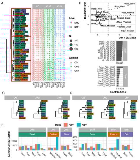Focusing on reads mapped onto gene models (+/− 5 Kpb), we further analyzed the differentially methylated cytosines (DMCs) and regions (DMRs) in the different comparisons (Figure 2A). In all comparisons considered among the nine samples, many more DMCs were found in the CG (16,024) and CHG (17,432) contexts than in the CHH context (4667). This difference was however less pronounced at the DMR level (CG: 4374; CHG: 4508; CHH: 2604). Detection of differential methylation at the DMR level has the advantage of integrating several single loci and is probably more robust as reducing stochastic DNA methylation variation and better reflecting the overall DNA methylation status of a genomic region. Here, DMRs in the CG and CHG contexts seemed to encompass many DMCs, as suggested by the difference in DMC and DMR numbers. Large variations were observed in the number of DMCs or DMRs depending on the biological comparison considered. For example, a total of 3202 DMCs were identified between Root and Yleafcat, while only 95 were detected between Distal and Yleaf.