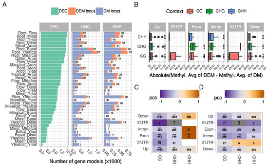 We next evaluated whether differential DNA methylation correlated with gene expression (Figure 3; Supplmentary Figure S3). A total of 18,839 genes were differentially expressed in at least one comparison (Figure 3A). All comparisons combined, differential methylation concerned 4866 and 3234 gene models at the DMC and DMR levels, respectively. The ratio between the number of genes that were only differentially methylated (DM) and those being simultaneously differentially expressed and methylated (thereafter named DEM) varied across comparisons. Firstly, it was neither linked to the total number of DEGs nor to the total number of DMCs/DMRs (Figure 3A). For example, the highest number of DEGs was found in comparisons between roots and aerial organs, but these comparisons did not display the largest number of DMCs/DMRs. Among gene models displaying DMCs, 22%, 16%, and 28% in the CG, CHG and CHH context, respectively, were also differentially expressed. The lower value in the CHG context was significant (Student’s t-test, p < 0.01) and indicated a lower overlap between differential expression and methylation in this context at the DMC level. Similarly, 28%, 21%, and 27% of the genes harboring DMRs in the CG, CHG, and CHH context, respectively, were also differentially expressed. Such ratios are in accordance with those found in other plants such as Brachypodium [42] where differential CG methylation explained between 1% and 9% of variation of tissue-specific variation in gene expression, soybean [40], or poplar [47]. By contrast, in rice subjected to cadmium stress, a larger overlap between DEG and DMCs/DMRs (>50%) has been detected in aerial parts of the plants [48].