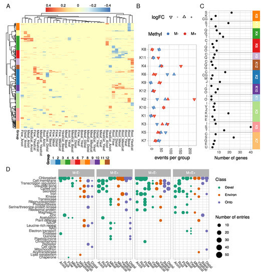 We next focused on DMRs and averaged them per gene loci to identify genes that were simultaneously differentially expressed and methylated in the same comparison. According to methylation differences between samples, we were able to detect 12 groups (from K1 to K12) using a correlation-based clustering with a dynamic tree cut [56] (Figure 4A). These groups contained specific gene sets with specific DNA methylation and expression profiles (Figure 4B). Gene functions were functionally analyzed by mapping genes to the Gene Ontology (GO) for each comparison separately (Figure S4). Functions for each of the 12 groups were also analyzed by GO enrichment analysis (Figure S5) as well as by using eggNOG mapping (Figure 4C). The lists of DEMs per cluster and per comparison are given in Tables S1 and S2, respectively, and summarized using their most represented UNIPROT keywords regarding their levels of methylation and expression (Figure 4B). The following sections describe the most relevant biological process where DEMs were identified in the different comparisons.