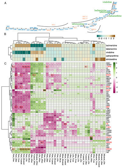 Alkaloid content in samples depicted in Figure 5B was obtained from a meta-analysis of our previously published results. Briefly, flash-frozen samples were lyophilized and extracted in methanol. Strictosidine, tabersonine, lochnericine, vindoline, and catharanthine were quantified on the same cultivar (Apricot Sunstorm) in the diverse tissue types [6,10,14] using a LC-MS/MS apparatus. Identification was confirmed by retention times and mass spectra of authentic standards.
