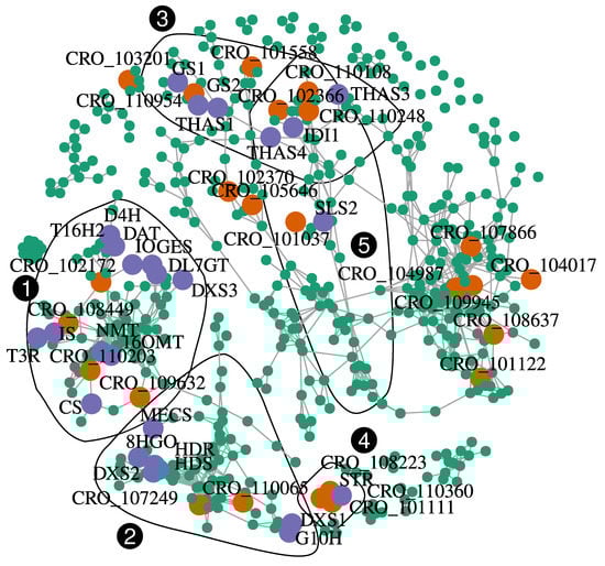 Co-expression network (Spearman’s rho correlation-based) visualizing transcriptional relationships among MIA genes and other differentially methylated and expressed genes detected in this study. MIA genes are indicated by purple points and black labels, while differentially expressed and methylated genes are indicated in turquoise or orange if they code potential transcription factors (Table 1). Genes are connected by grey segments if their Spearman’s rho coefficient was above 0.95. Black polygons correspond to communities detected with a fast greedy modularity optimization based algorithm. Only communities containing at least one MIA gene are shown. Numbers in white in black circles correspond to community identification numbers.