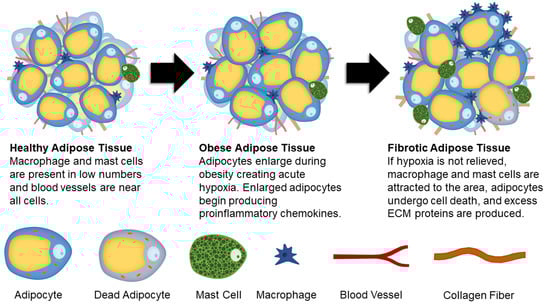 Another cell population that has been linked to adipose tissue fibrosis is mast cells [57,58]. Mast cells can promote fibroblast growth and collagen production by releasing cytokines, chemokines, proteases, etc. [59,60]. By comparing adipose tissue from obese patients with the metabolic syndrome to healthy patients, it was determined that there is an accumulation of mast cells in the subcutaneous adipose tissue of obese patients. Related to fibrotic changes, there were positive correlations to collagen, leptin, and glucose concentrations, as well as waist circumference [57,61]. Overall, more research is needed to determine the role of mast cells and macrophages in the fibrotic transition of adipose tissues.