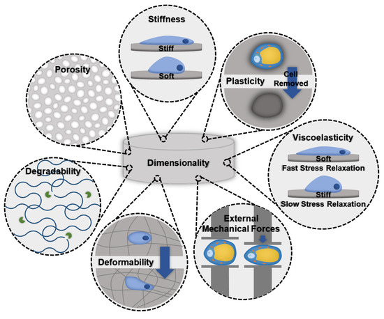 - Plasticity: Plasticity is an intrinsic material property that is related to stiffness and viscoelasticity. Several studies have found that cells are able to plastically remodel certain biomaterial environments, such as collagen and fibrin gels [107,108,109]. Cells align and compact the fibers around them to the point where, when the cells are removed, voids remain [110]. Healthy adipose tissue is a dynamic organ that is remodeled constantly to allow fluctuations in adipocyte size to meet energy storage and demand needs. However, adipose tissue fibrosis limits the capacity of adipose tissue to remodel [111]. The addition of crosslinks can lower the accessibility of cells to remodel the biomaterial [112].