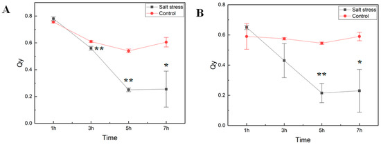Photosynthetic efficiency of photosystem II. The maximal quantum yield of photosystem II (PSII) photochemistry (Fv/Fm) (A) and the efficiency of excitation capture of the open PSII center (Fv’/Fm’) (B) in cv. Crimson Sweet leaves under salt stress were measured using FluorPen (PAR-FluorPen FP 110/D). Asterisks ** and * represent significant difference at p < 0.05 and p < 0.1, respectively. Qy, equal to Fv/Fm in the dark (A) or light-adapted (B) samples, photosystem II efficiency. The error bars represent the standard deviation.