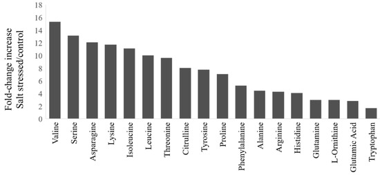 Fold-change increases in amino acids in watermelon leaves due to salt stress: The fold-change in plants treated with NaCl relative to the control group for amino acids showing significant changes (t-test, p < 0.05). The absolute amino acid quantities were normalized using internal standards and expressed as fold-change relative to control.