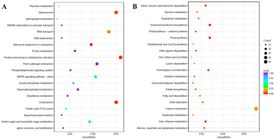 Kyoto Encyclopedia of Genes and Genomes (KEGG) enrichment scatter plot. The KEGG enrichment analysis showing the top 20 enriched pathways for up-regulated (A) and down-regulated (B) DEGs. The horizontal axis is GeneRatio (the ratio between the number of differentially expressed genes in each pathway, and all differentially expressed genes that can be found in the KEGG database). The vertical axis is the description of the KEGG term. The significance showing padj q-values are shown as a color scale, where the color and size of the dots represent the range of q-value and the number of DEGs mapped to the individual pathways, respectively.