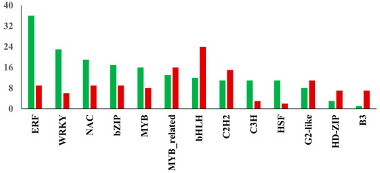 Distribution of transcription factor families. The red and green bars show the total number of down-regulated and up-regulated TFs in the respective family, respectively.