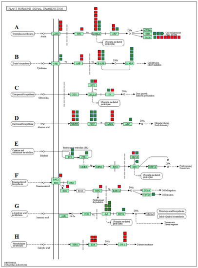DEGs mapped to the plant hormone signaling transduction pathways in watermelon leaves. (A) Auxin signaling pathway, (B) cytokinin pathway, (C) gibberellin (GA) pathway, (D) abscisic acid pathway, (E) ethylene signaling pathway, (F) brassinosteroid pathway, (G) jasmonic acid pathway, (H) salicylic acid pathway. The red and green boxes show the number of down- or up-regulated DEGs, respectively.