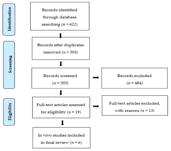 The result of our search strategy was 622 articles initially identified through database searches. One hundred and nineteen duplicate studies were discarded, leaving 503 single studies. An additional 484 studies were removed after the title and abstract screening, excluding non-English articles, studies not addressing the research question, and expert opinion articles. Nineteen full-text articles were reviewed for eligibility for inclusion in the final analysis. Further evaluation showed that 40%, or six of these 19 records, were in vivo studies and were therefore included in this review. As the focus of this review was on in vivo studies, the in vitro studies were subsequently excluded (Figure 1).