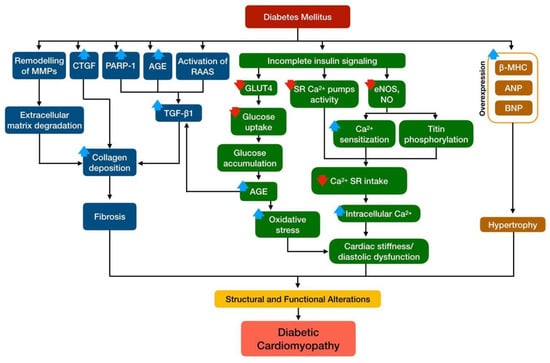 DCM is initially described by myocardial fibrosis, dysfunctional remodeling, and associated diastolic dysfunction, soon after by systolic dysfunction, and ultimately by clinical heart failure. Several mechanisms have been implicated in the development and progression of DCM, including disruption in cardiac insulin signaling, mitochondrial dysfunction, oxidative stress, inflammation, impaired calcium handling, endoplasmic reticulum stress, microvascular dysfunction, renin–angiotensin–aldosterone system (RAAS) activation, and a multitude of cardiac metabolic abnormalities [19,20,21,22,23,24,25,26]. Among all complications of diabetes, DCM contributes to nearly 80% of mortality in patients with diabetes mellitus [27].