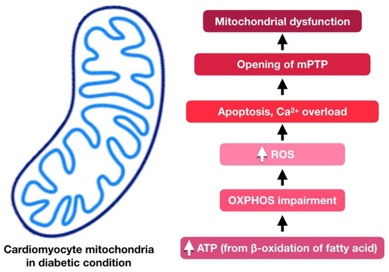 Involvement of mitochondrial dysfunction in diabetic cardiomyopathy. The adenosine triphosphate (ATP) was generated from fatty acid oxidation instead of glucose in the diabetic condition, which generates more ROS and disrupts the oxidative phosphorylation process. Consequently, apoptosis occurs following impairment of mitochondrial Ca2+ handling, which leads to mitochondrial respiratory dysfunction. Ca2+ overload also causes mitochondria permeability transition pore (mPTP) opening, leading to mitochondrial dysfunction.