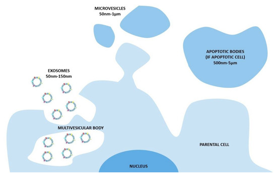 Every day, in the human body, cells release in the extracellular space particles delimited by a lipid bilayer that cannot replicate. Such particles are defined as extracellular vesicles (EVs) [8]. This general term encompasses a huge number of structures, referred as exosomes, microvesicles, microparticles, ectosomes, oncosomes, apoptotic bodies, and many other names [8], which differ in biogenesis, release pathways, size, content, and function. The classification of these EVs is a complex matter because they overlap in terms of many characteristics; thus, more than one parameter must be taken into account [8]. Furthermore, they are not associated to specific cells because every cell is able to release more than one EV type.