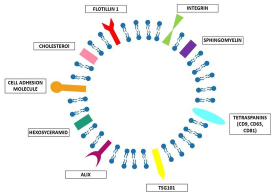 Schematic representation of EVs’ basic composition, including: integrins; tetraspanins such as CD9, CD63 and CD81; TSG101; Alix; cell adhesion molecule; flotillin1; cholesterol; sphingomyelin; and hexosyceramid.