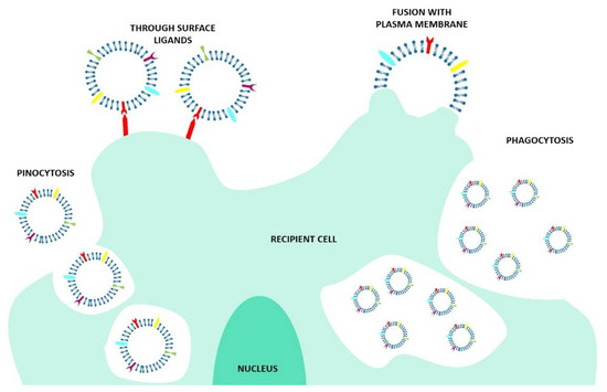 Schematic view of the mechanisms involved in the cellular uptake of EVs. In particular, EVs can interact with the cell through surface ligands, or they can be internalized through pinocytosis, phagocytosis, or fusing with the plasma membrane.