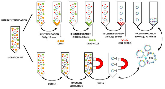 Example of EV isolation: differential ultracentrifugation with the various centrifugation steps from [38] and the isolation kit process.