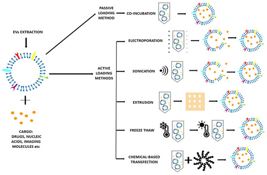 Scheme of the various loading methods with which it is possible to load EVs with the desired cargo. Specifically, the EV loading can follow two main approaches: the passive (co-incubation) and the active encapsulation (electroporation, sonication, extrusion, freeze–thaw, chemical-based transfection). The passive encapsulation is a relatively simple method in which the EV loading is obtained only through a co-incubation of the EVs and cargo, without the use of external stimuli. On the contrary, in the active encapsulation, the EVs are forced to load the cargo using many different strategies.