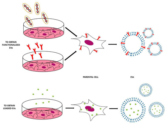 Scheme of the indirect methods used to engineer the EVs, both to functionalize EVs with the molecules of interest (to obtain EVs that expose these molecules on their surface) and to obtain EVs loaded with the desired cargo.