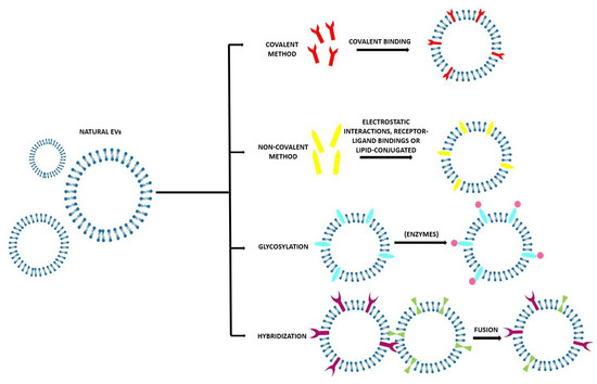 Scheme of the various direct methods to obtain engineered EVs with the desired characteristics and with the molecules of interest on the surface. In particular, covalent method; non-covalent methods such as electrostatic interaction; receptor–ligand binding; or lipid conjugation, glycosylation, or hybridization.