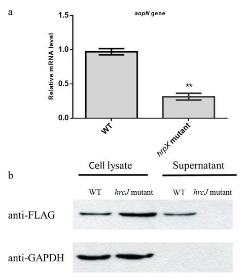 Analysis and identification of AopN as a type III secreted effector. (a) Quantitative PCR (qPCR) assays were performed to determine whether aopN was regulated by hrpX. The wild-type (WT) strain and its hrpX mutant were cultured in the T3SS-inducing medium. RNA was extracted and reverse transcribed into cDNA, which was subjected to qPCR assays. The rpoB was used as the internal reference gene [17]. The experiment was performed three times, with similar results obtained each time. Data represent the means ± SD (n = 3). ** above bars indicate significant differences as determined by t-test, p < 0.05; (b) Identification of AopN as a type 3 effector by Western blotting. WT strain Aac5 and its T3SS-deficient hrcJ mutant expressing the AopN-fused FLAG protein was cultured in KB medium until the logarithmic growth phase and then cultured in the T3SS-inducing medium for 4 h. Subsequently, intracellular components and exocrine protein components were extracted and detected using the anti-FLAG antibody. Signals were detected in the intracellular component of the WT and hrcJ, as well as the supernatant of the WT, but no signal was detected in the exocrine component of hrcJ mutant carrying the AopP-FLAG. The antibody GAPDH was used as the internal reference protein [17]. The experiment was performed three times, with similar results obtained each time.