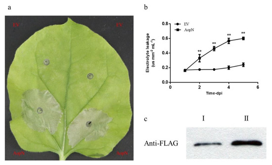 AopN induced program cell death (PCD) in N. benthamiana. (a) AopN induced PCD symptoms in N. benthamiana. The N. benthamiana leaves injected with Agrobacterium tumefaciens GV3101 strain carrying 35S: AopN-FLAG or the empty vector (EV) control were sampled 3 days after inoculation. The experiment was performed three times, with similar results obtained each time. Three independent assays were conducted and at least 10 plants with 20 different leaves were observed. (b) Conductivity test with AopN. The N. benthamiana leaves were injected with A. tumefaciens GV3101 strain carrying 35S: AopN-FLAG or the empty vector. Leaf disks at the injection site were removed with a puncher and placed in 5 mL sterile water in a six-well dish. After resting for 24 h, conductivity levels were measured using a conductivity meter (DDS-307, Leici Experimental Instrument Factory, Shanghai China). The experiment was performed three times, with similar results obtained each time. Data represent the means ± SD (n = 6). ** above bars indicate significant differences as determined by t-test, p < 0.05. (c) Analysis of AopN protein secretion. The leaves at the injection site were collected and proteins were detected by Western blotting. I represents the 36 h sample, II represents the 48 h sample. The experiment was performed three times, with similar results obtained each time.