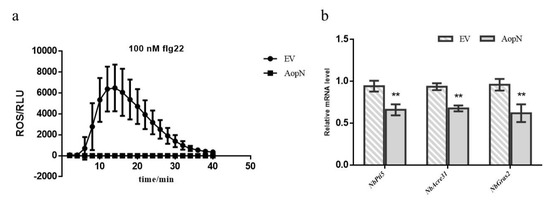 To examine whether AopN affected ROS burst, an flg22-induced ROS assay was performed. Since the early PCD response of plant can also trigger ROS [24], it is necessary to find a suitable expression time point to detect this effect. The electrolyte leakage is an important indicator to measure the PCD response of plants. Based on the above results (Figure 5b), AopN induced the electrolyte leakage of N. benthamiana at 24 h and showed no significant difference compared to empty vector (EV) control using A. tumefaciens GV3101 at an optical density at 600 nm (OD600) of 0.5. At this point in time, the AopN fused FLAG can be expressed in N. benthamiana by Western blot (Figure 5c). Therefore, it is reasonable to test whether AopN affects ROS under this condition (24 h, A. tumefaciens GV3101 at an optical density at OD600 of 0.5). The signal intensity generated by 35S: AopN-FLAG treatment during 40 min was significantly lower than that of the control treatment (empty vector) (Figure 6a), when expressed in N. benthaamiana. To further analyze the effect of ROS inhibition, the PTI marker gene expression levels were detected by qPCR with flg22 treatment or no-flg22 treatment. The results showed that the expression levels of NbPti5, NbAcre31, and NbGras2 were significantly reduced when 35S: AopN-FLAG was expressed compared with that under the empty vector control treatment with flg22 treatment (Figure 6b). Importantly, the expression levels of NbPti5, NbAcre31, and NbGras2 were also significantly reduced when 35S: AopN-FLAG was expressed compared with that under the empty vector control treatment without flg22 treatment (Figure S1). These results indicate that AopN suppressed the PTI pathway by regulating the ROS burst in N. benthamiana.