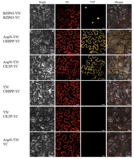 To generate BiFC constructs, the full-length cDNA of AopN was cloned into a pSPYNE®173 vector [44], and the full-length cDNA of ClHIPP and ClLTP was cloned into the pSPYCE (M) vector [44]. The constructs were co-expressed in N. benthamiana leaves for analysis, as previously described [44,45]. After 48 h, at an excitation wavelength of 488 nm to acquire fluorescent images, the plasma membrane marker dye (Dil, D3911, Thermo Scientific, Waltham, MA, USA) was used as the control for PM localization. For Dil staining, the N. benthamiana leaves were injected with 1 μM of Dil solution for 20 min. Then, the fluorescence signal was visualized under a Zeiss LSM 880 laser confocal microscope (Zeiss, Jena, Germany). Yellow fluorescent protein imaging was performed at an excitation wavelength of 513 nm. The Dil imaging was performed at an excitation wavelength of 550 nm. The experiment was independently repeated three times. All primers used in the PCR are listed in Table S2.