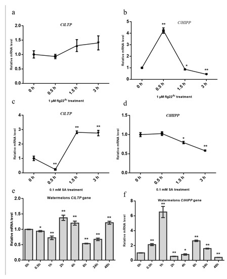 To further clarify whether the two interacting targets responds to A. citrulli infection. An flg22-induced assay was performed. The flg22Ac from FliC of A. citrulli was use. The watermelon leaves were sprayed with flg22Ac and the qPCR assay was performed. The expression levels of ClLTP were not associated with flg22Ac, but the expression levels of ClHIPP were associated with flg22Ac (Figure 9b). Further analysis shows that the expression levels of ClLTP and ClHIPP were associated with 0.1 mM salicylic acid (SA) treatment (Figure 9c,d). In order to more accurately assess the impact of this transcription level, watermelon cotyledons are sprayed with A. citrulli strain Aac5 at 3 × 108 CFU/mL. In this study, total RNA of watermelon cotyledons at eight different time points during Aac5 infecting were extracted, and then two genes containing ClLTP and ClHIPP were tested by qPCR technology. The expression levels of ClLTP at 0.5 h, 1 h, 2 h, 4 h, 6 h, 24 h, 48 h after Aac5 infected significant differences compared to the expression levels of ClLTP at 0 h (Figure 9e), which is up-regulated at 2 h, 4 h, 48 h time points, and down-regulated at 0.5 h, 1 h, 6 h, 24 h time points. Similarly, the expression levels of ClHIPP at 0.5 h, 1 h, 2 h, 4 h, 6 h, 24 h, 48 h after Aac5 infected significant differences compared to the expression levels of ClHIPP at 0 h (Figure 9f), which is up-regulated at 0.5 h, 1 h, 6 h, 24 h time points, and down-regulated at 2 h, 4 h, 48 h time points. As flg22 triggers plant immunity [25], and salicylic acid (SA) is closely related to plant immune response [26], the flg22Ac treatment and SA treatment support this conclusion (Figure 9e,f). These findings indicate that ClHIPP and ClLTP responds to A. citrulli strain Aac5 infection.