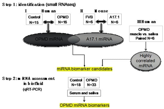 Raz, V.; Kroon, R.H.M.J.M.; Mei, H.; Riaz, M.; Buermans, H.; Lassche, S.; Horlings, C.; Swart, B.D.; Kalf, J.; Harish, P.; et al. Age-Associated Salivary MicroRNA Biomarkers for Oculopharyngeal Muscular Dystrophy. Int. J. Mol. Sci. 2020, 21, 6059. https://doi.org/10.3390/ijms21176059