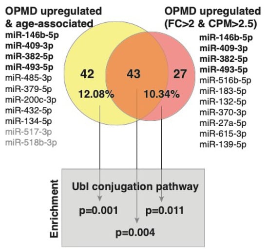 2.2. Characteristics of the OPMD-Deregulated miRNAs in Humans