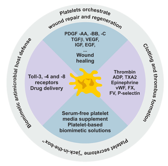 - Andrade, S.S.; Faria, A.V.D.S.; Queluz, D.D.P.; Ferreira-Halder, C.V. Platelets as a ‘natural factory’ for growth factor production that sustains normal (and pathological) cell biology. Boil. Chem. 2020, 401, 471–476. [Google Scholar] [CrossRef] [PubMed]