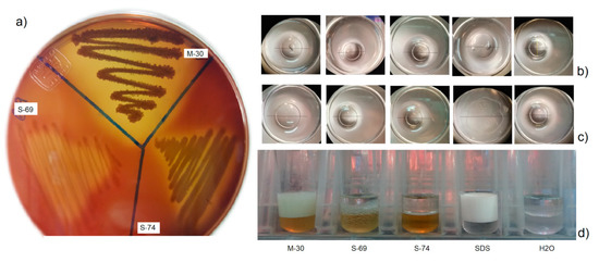 Within the methodologies used to detect the production capacity of biosurfactants in the bacterial supernatant, the more sensitive described in the literature were the drop collapsing and oil displacement. In the case of hemolytic activity, not all biosurfactants have this activity, for this reason, we used it as a complementary test [49,50]. In our study, supernatants of My-30, S-69 and S-74 showed, indeed, a different degree of ability to produce biosurfactants.
