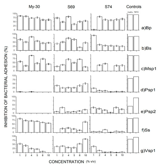 Assessment of the efficiency of bacterial supernatants of Bacillus niabensis (My-30 and S-69) and Ralstonia sp. (S-74) for the inhibition of bacterial adhesion, (a) Bp (Bacillus pumilus), (b) Bs (Bacillus subtilis), (c) Msp1 (Micrococcus sp. 1), (d) Psp1 (Pseudoalteromonas sp.1), (e) Psp2 (Pseudoalteromonas sp.2), (f) Ss (Sagittula stellata) and (g) Vsp1 (Vibrio sp.1). Controls CuSO4 (Cu) and TBTO were assayed at 10 µg mL−1.